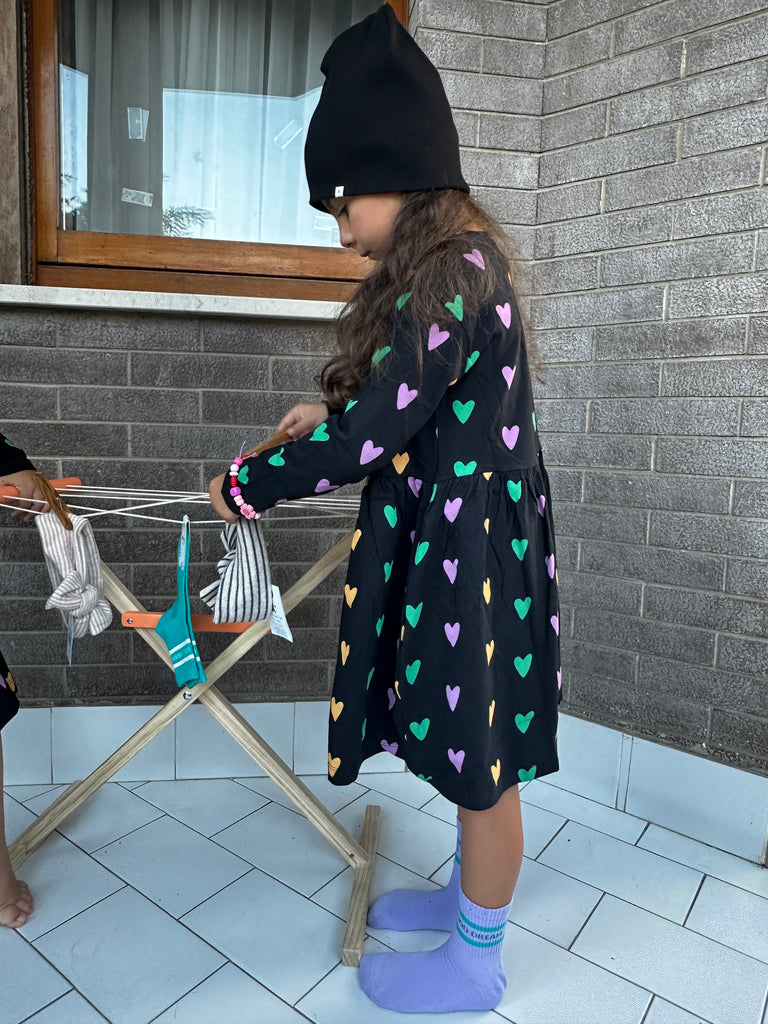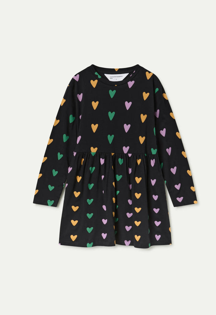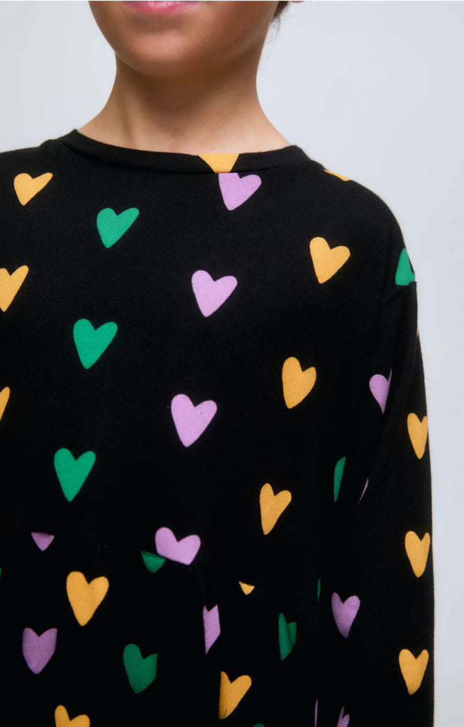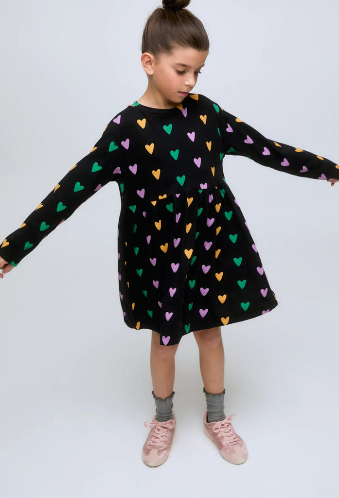 Abito corto nero in cotone per bambine con stampa cuori colorati. Presenta maniche lunghe, vita arricciata, tasche laterali e scollo rotondo.