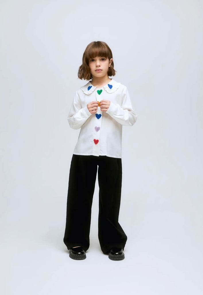 Camicia bianca da bambina in tessuto, con maniche lunghe e scollo rotondo, decorata con volant e cuori ricamati. Abbottonatura frontale con dettagli a cuore.