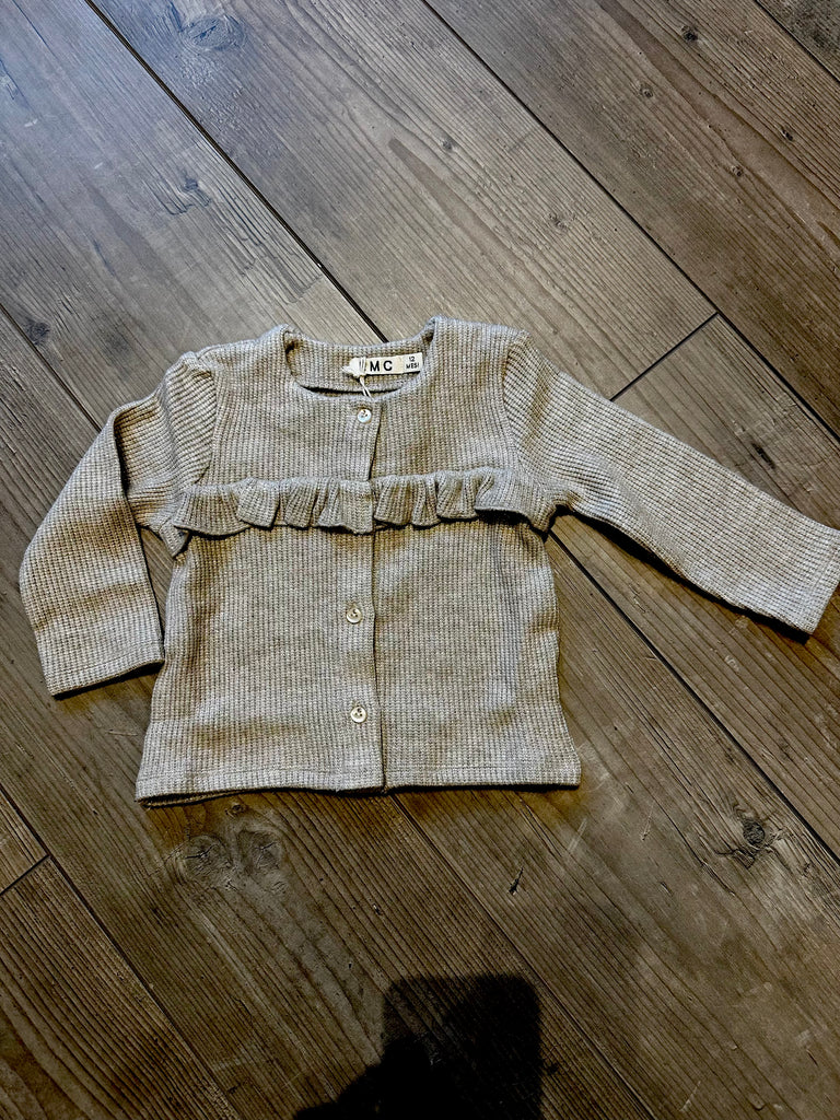 Cardigan a girocollo, in maglia écru effetto lurex, bottoni con strassetto, balza dopo il primo bottone.