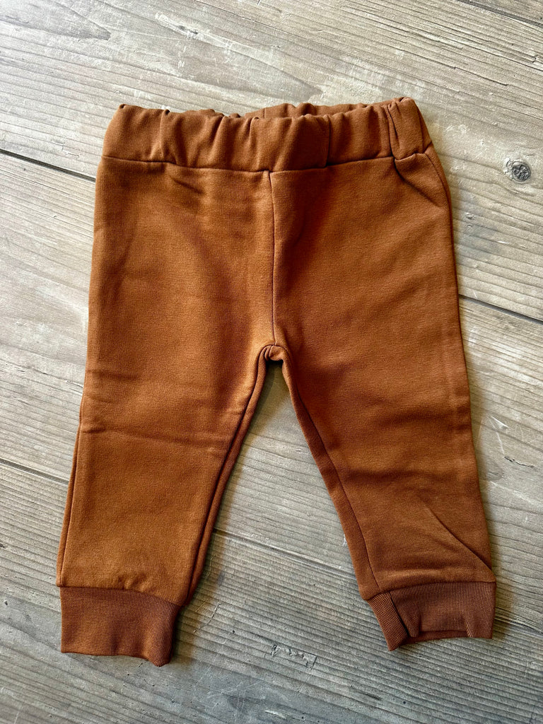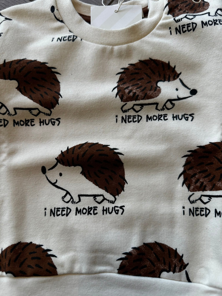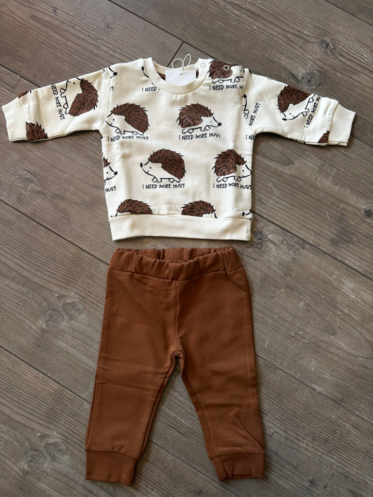 Completo formato da felpina a girocollo con polsini e cannolè, color panna con stampa ricci e pantalone con elastico in vita e polsini.