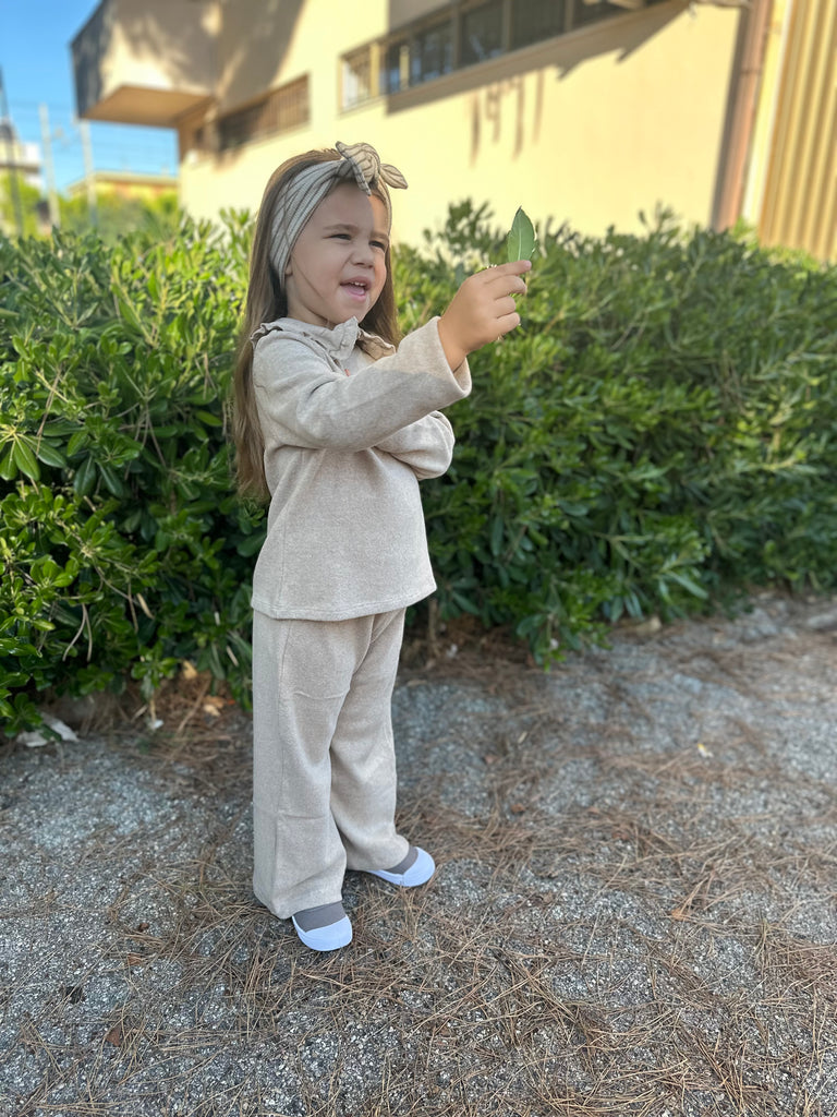Disponibile in 4 varianti: tinta unita grigio, latte con righine rosa, beige con righe marroni e beige con righe blu.