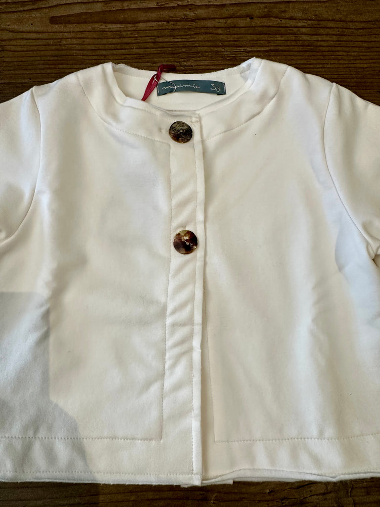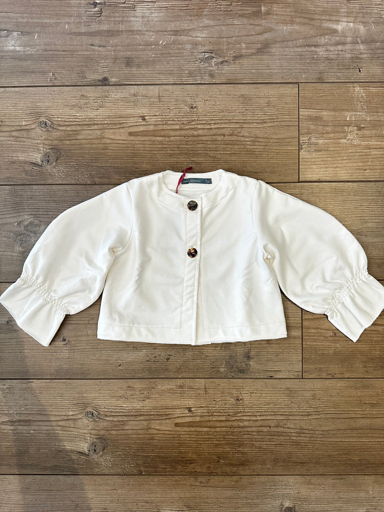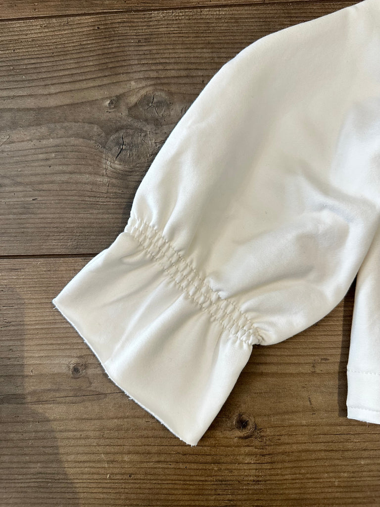 Felpina calda all’interno, a girocollo, aperta sul davanti con due bottoni, modello un po’ svasato, manica a palloncino con drappeggio.