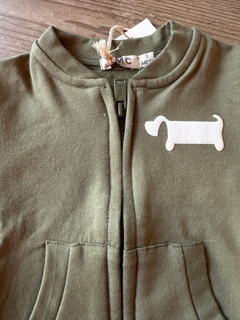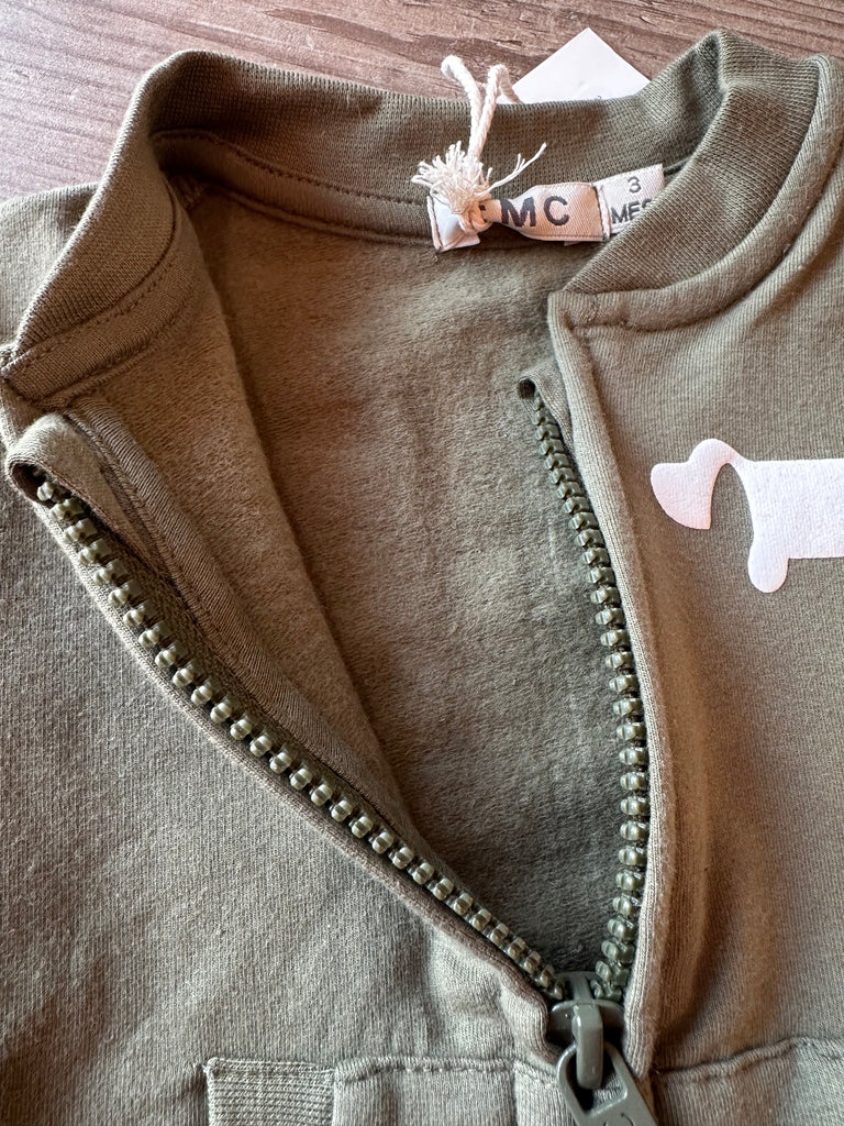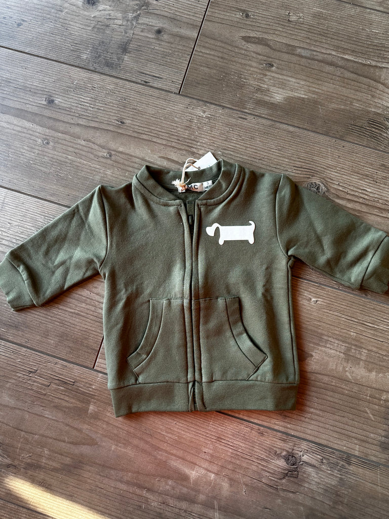 Felpa con zip, in cotone caldo, con polsini e cannolè, taschine sul davanti, color verde militare con stampa bianca bassotto.