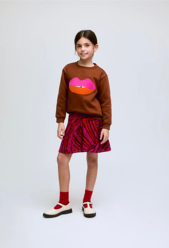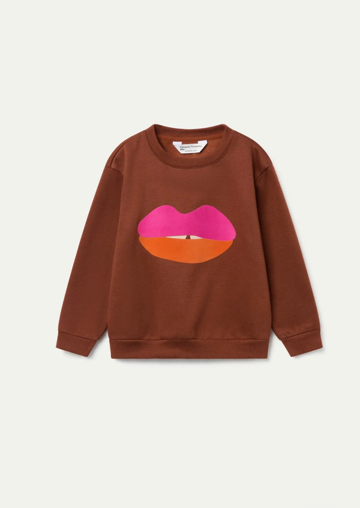 Felpa a girocollo, calda all’ interno, con polsini e cannolè, marrone con stampa bocca fuxia e arancione.