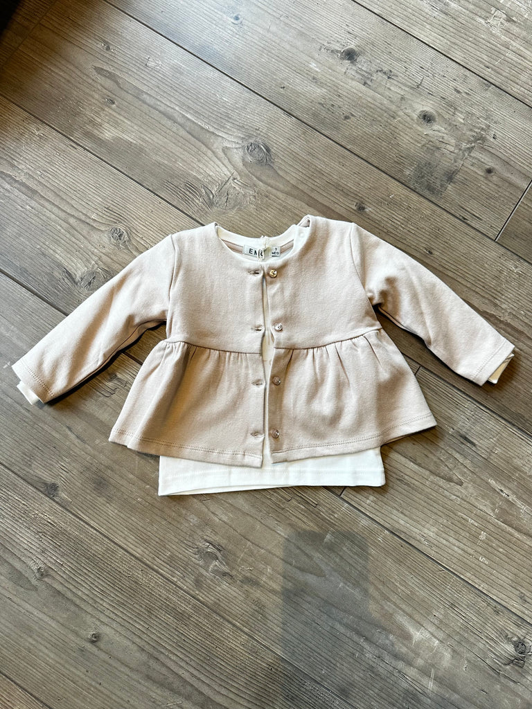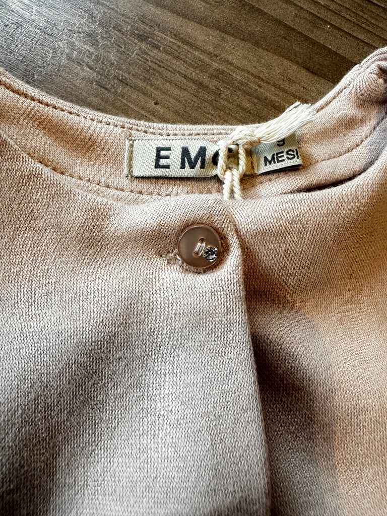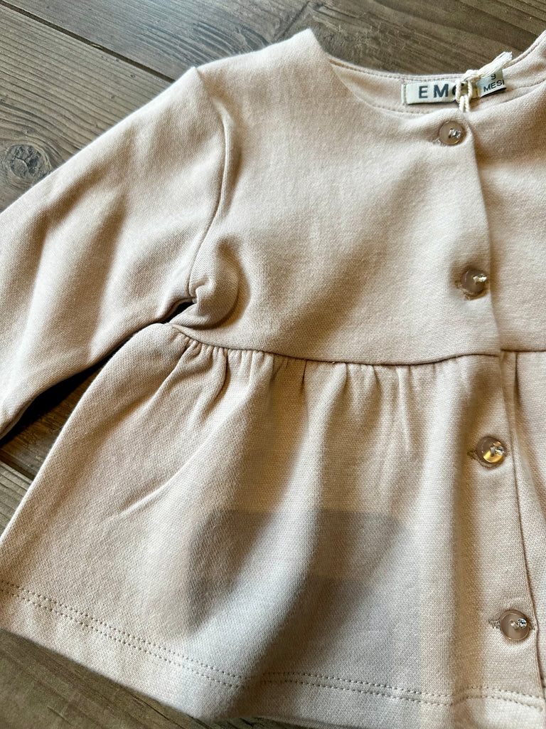 Felpina a girocollo, aperta sul davanti, bottoni con strass, taglio sulla vita, color beige, cotone caldo.