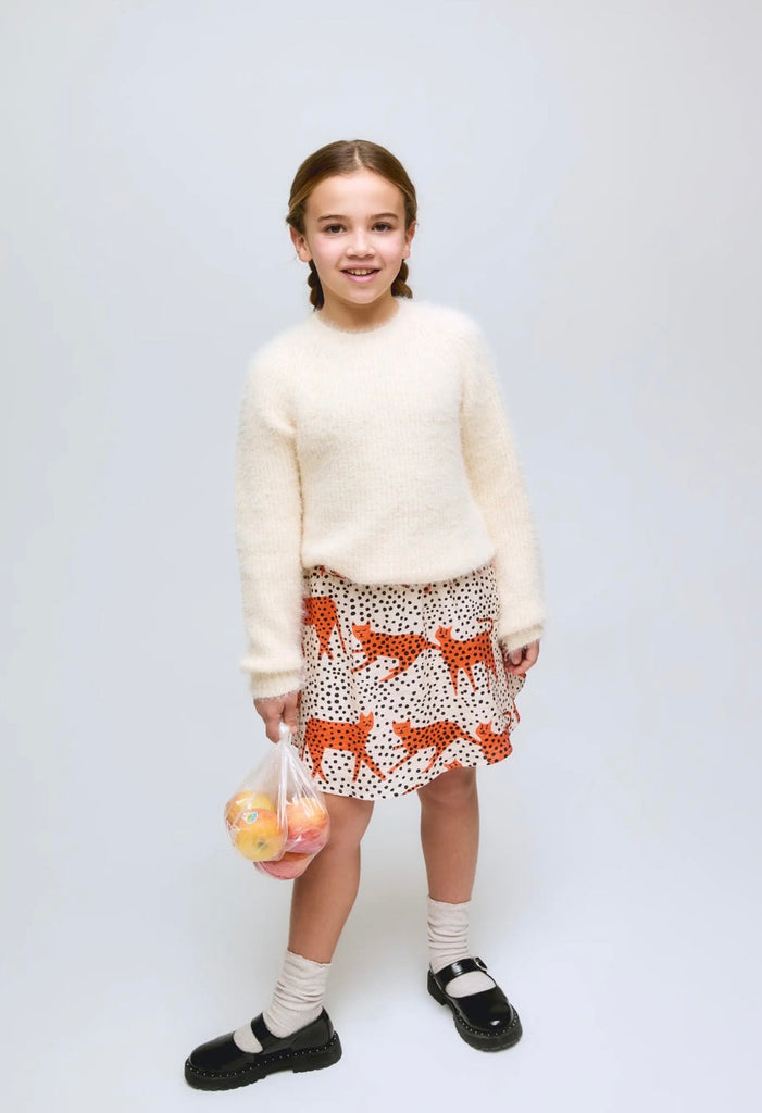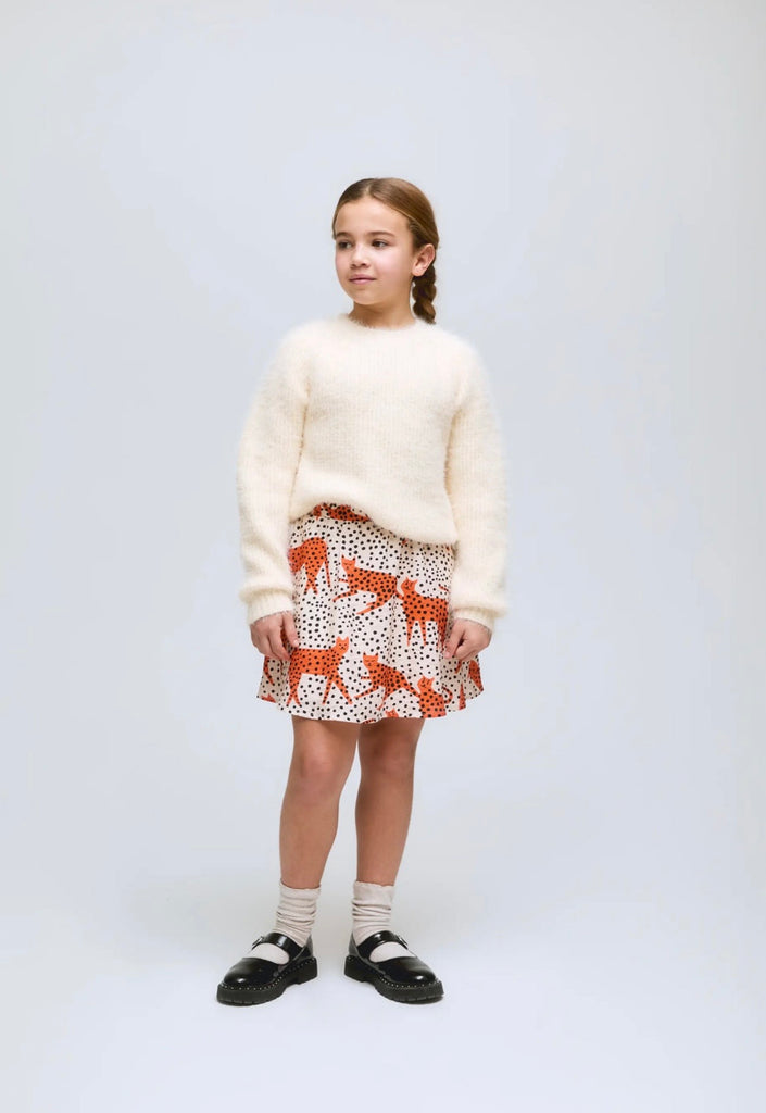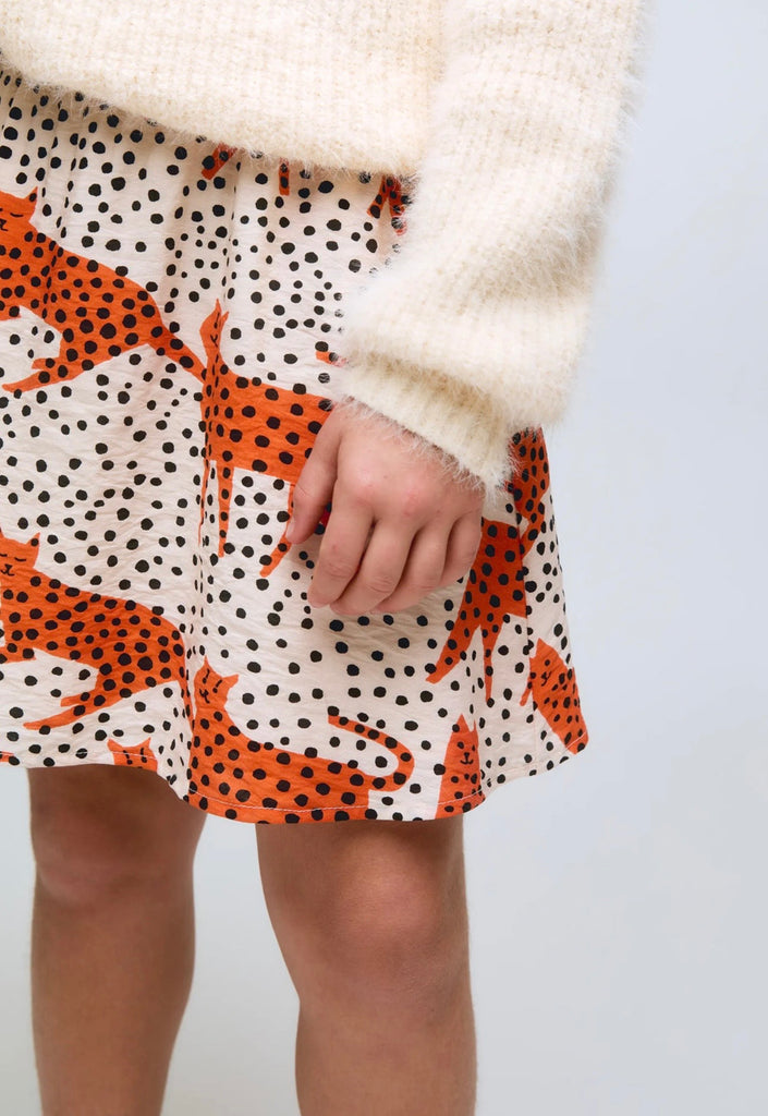 Gonna corta da bambina, panna, con stampa pois neri e gatti arancioni, elastico in vita per una vestibilità perfetta e pratiche tasche laterali.