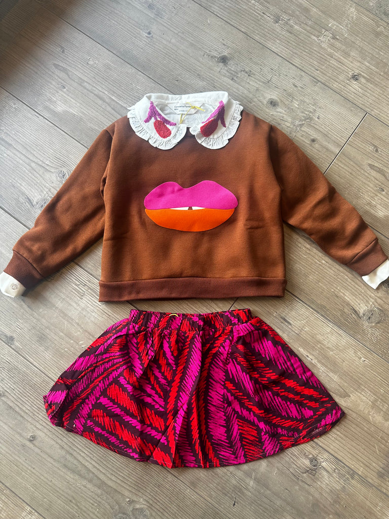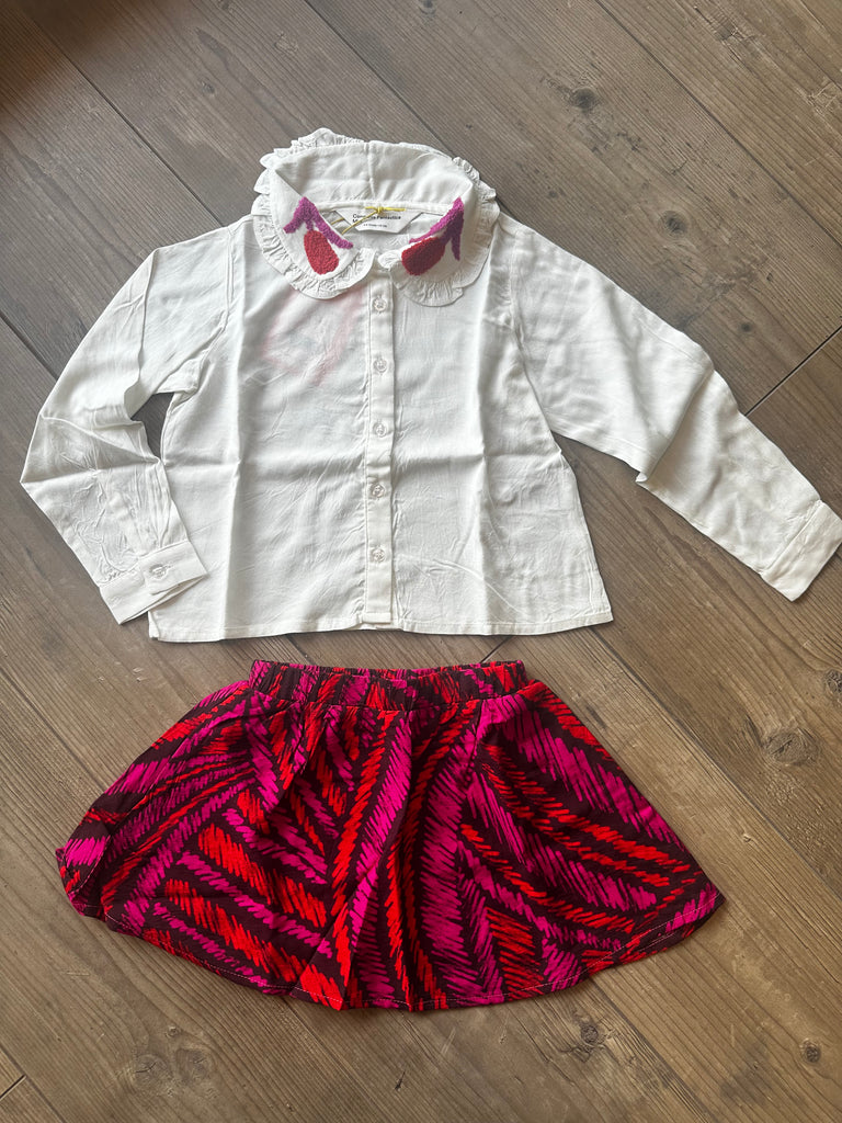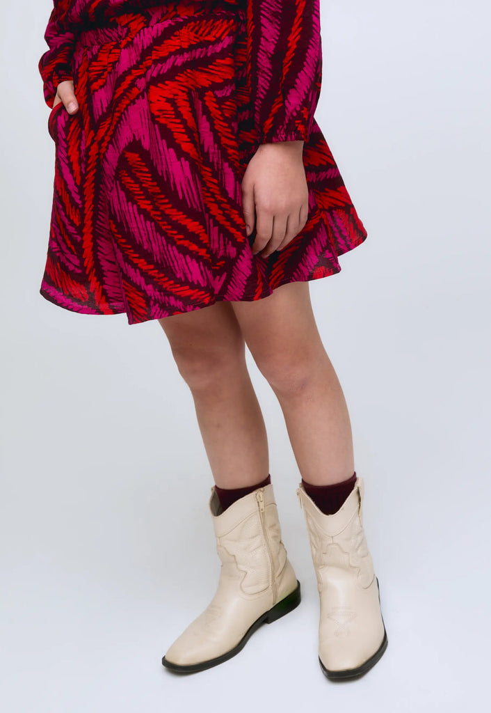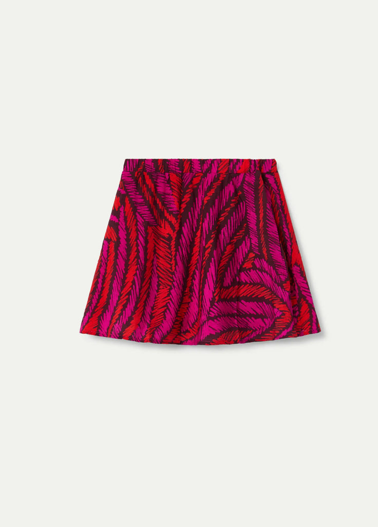Gonna corta da bambina in crêpe leggero con stampa sui toni del fuxia. Elastico in vita. Foderata.