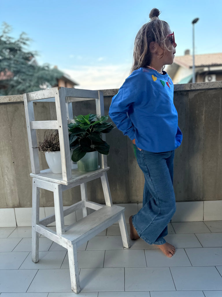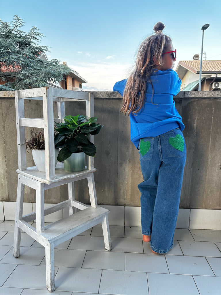 Jeans blu da bambina con gamba larga e vita alta. Presentano tasche nella parte posteriore, chiusura con cerniera e bottone in metallo. Dettaglio grafico a forma di cuore verde sulle tasche posteriori.
