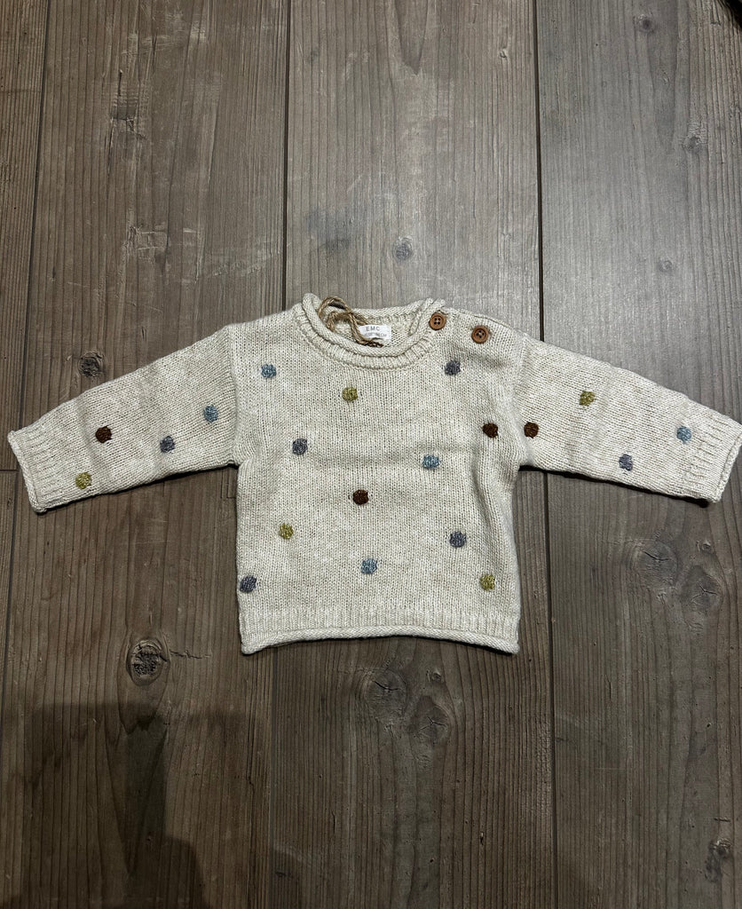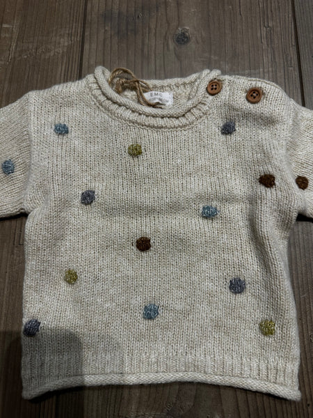 Maglioncino a girocollo, in maglia, color écru con pois ricamati sui colori neutri.