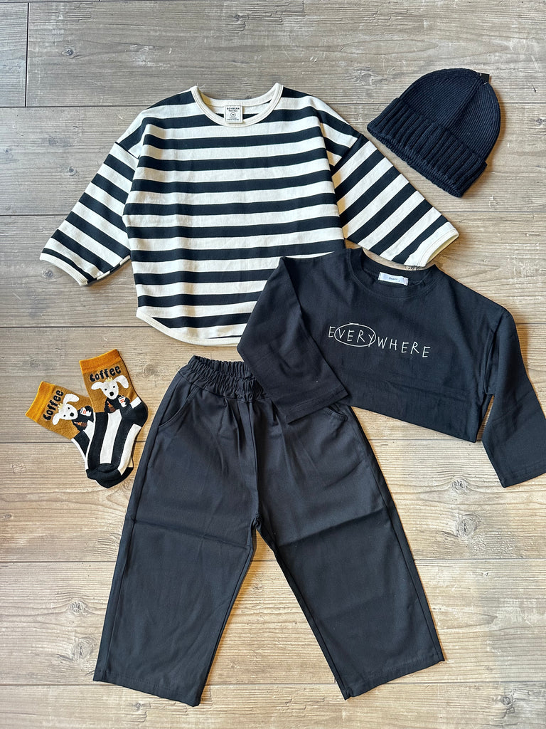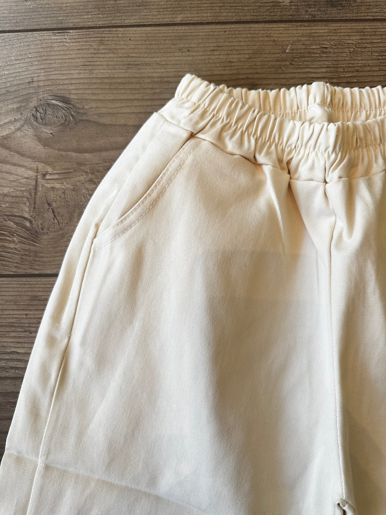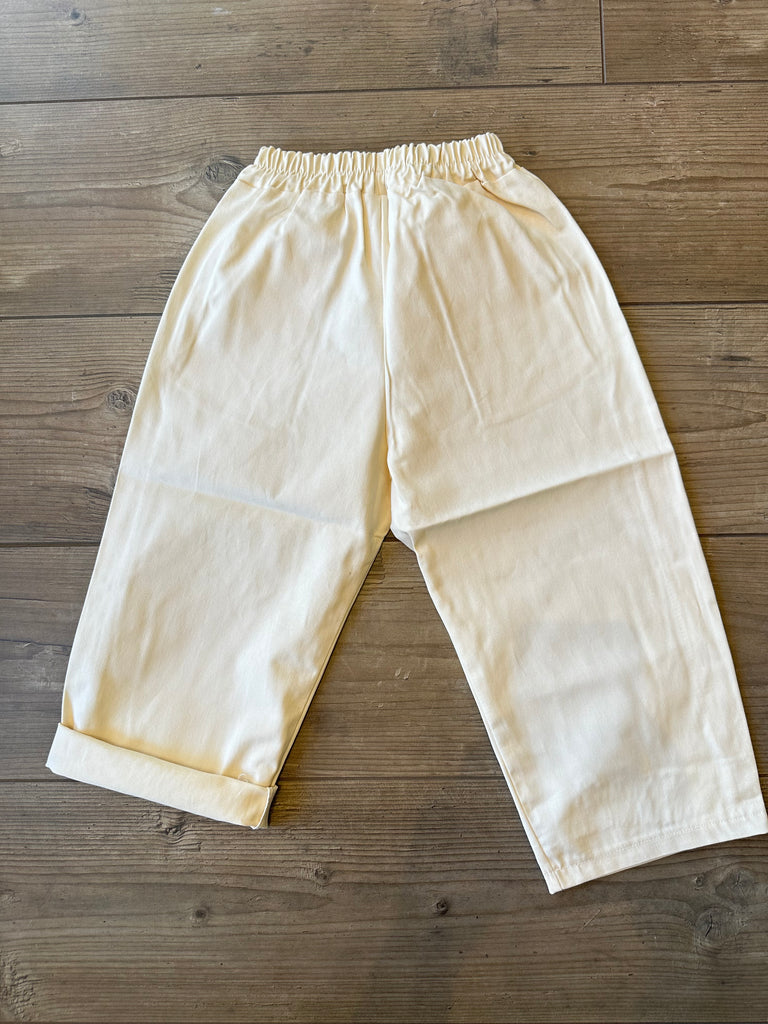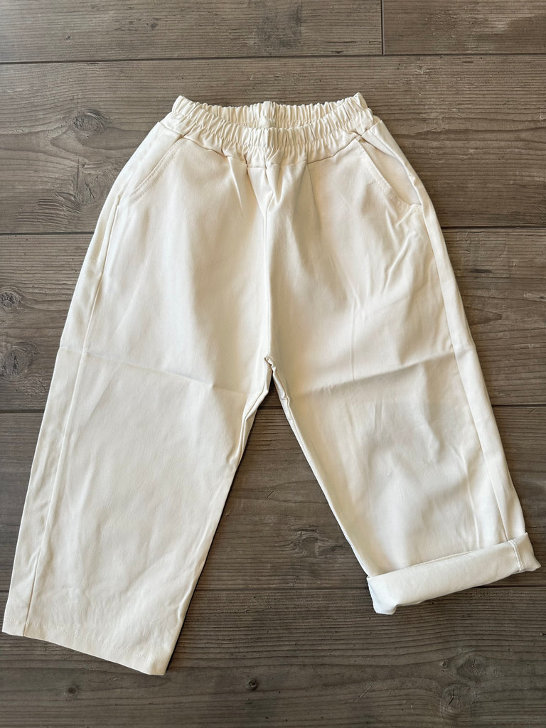 Pantalone con elastico morbido in vita, fit largo, tasche laterali a scomparsa sul davanti, unisex, disponibile in due varianti colore: crema e nero.