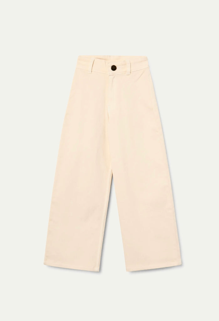 Pantaloni color latte, da bambina, a gamba larga con tasche e vita aderente. Presentano passante per cintura e chiusura con bottone.