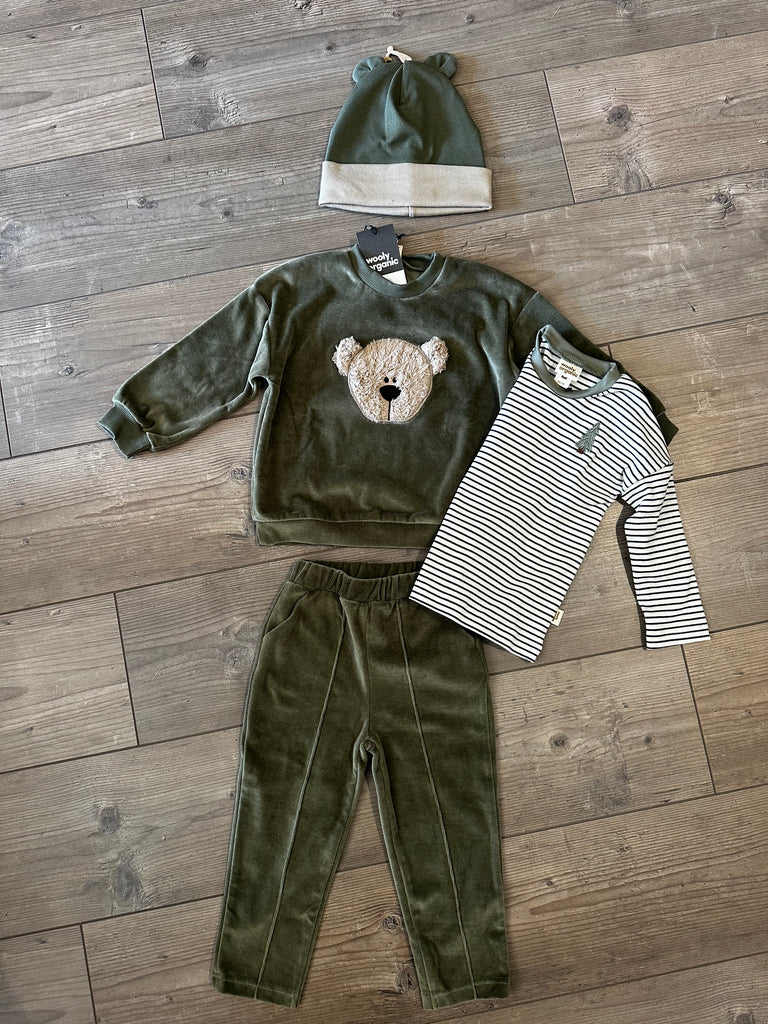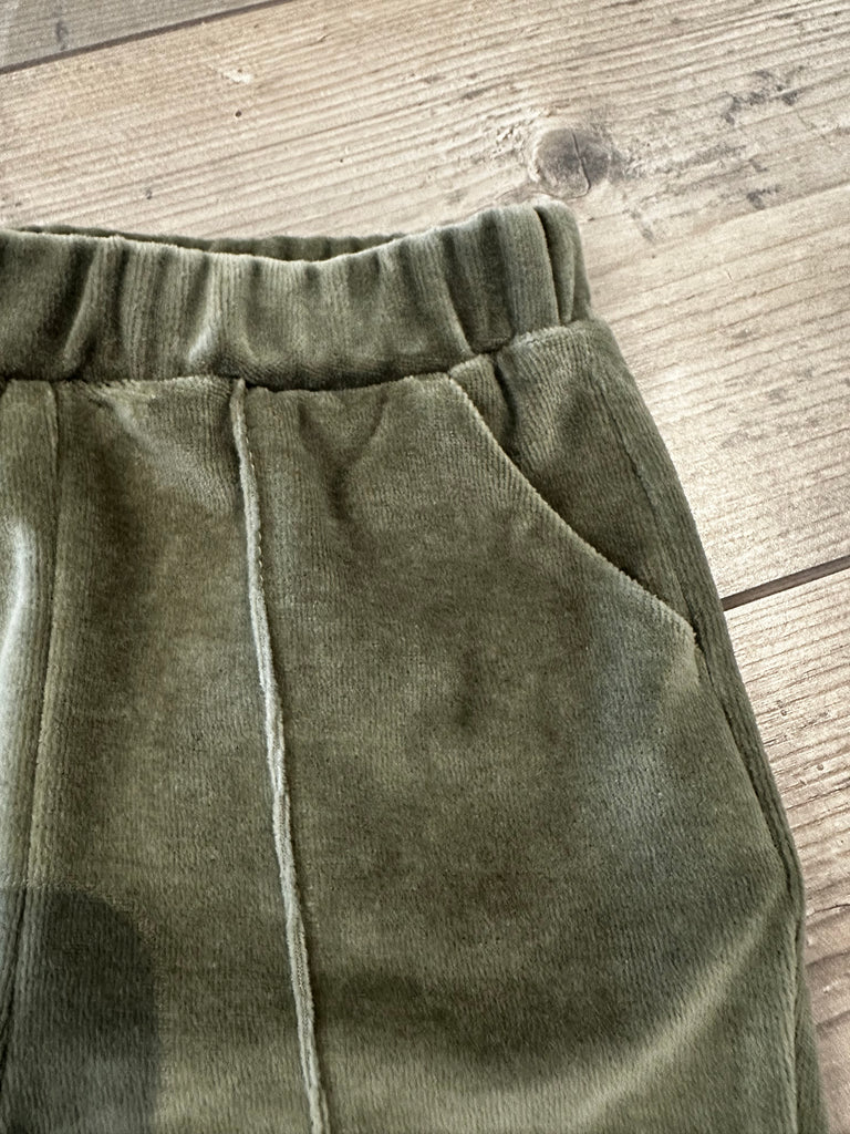 Pantalone in ciniglia, modello dritto con piega davanti, elastico morbido in vita.