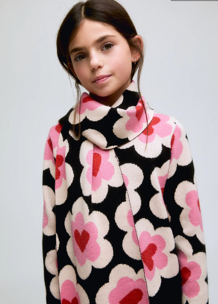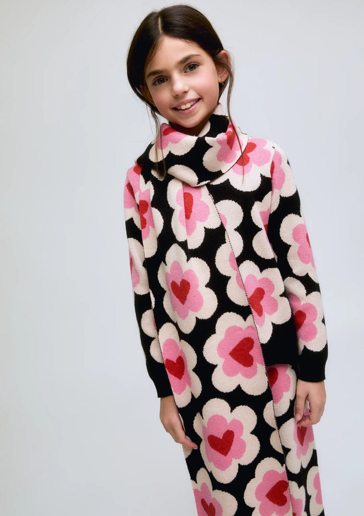 Sciarpa nera da bambina in maglia con stampa fiori a forma di cuore.