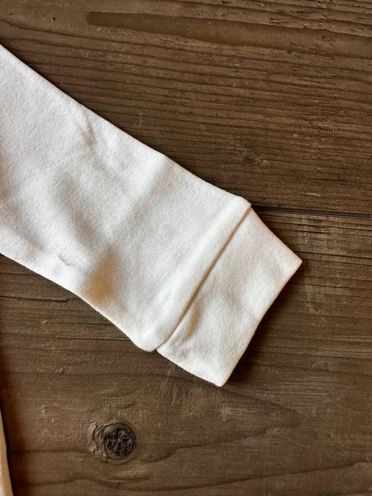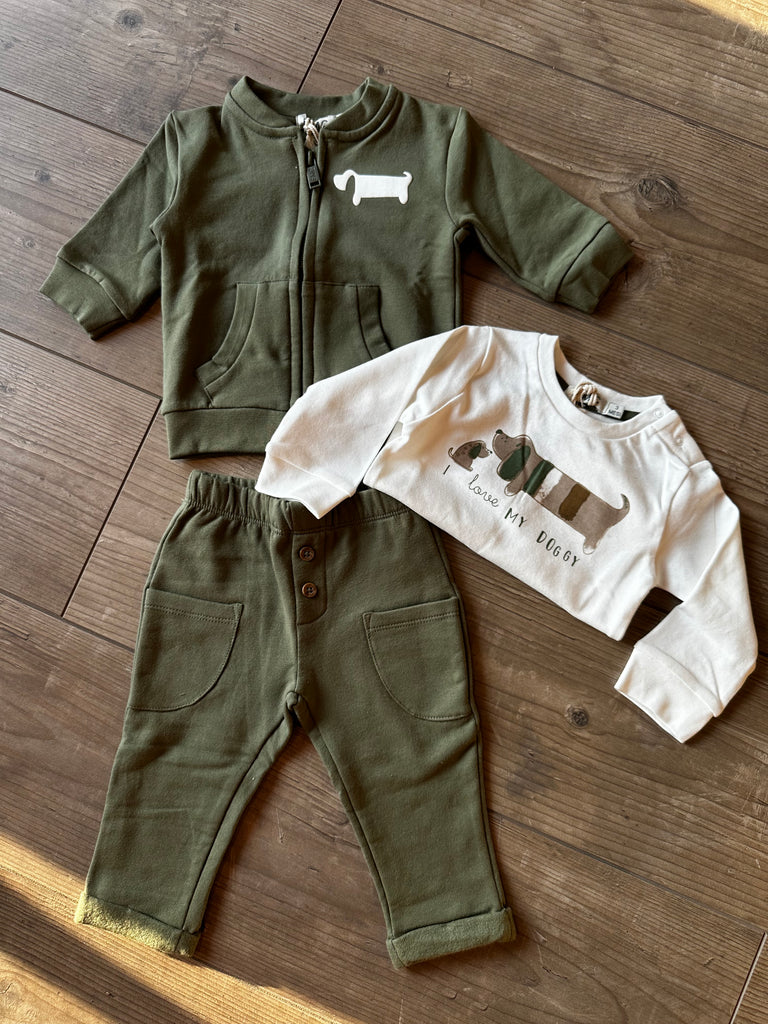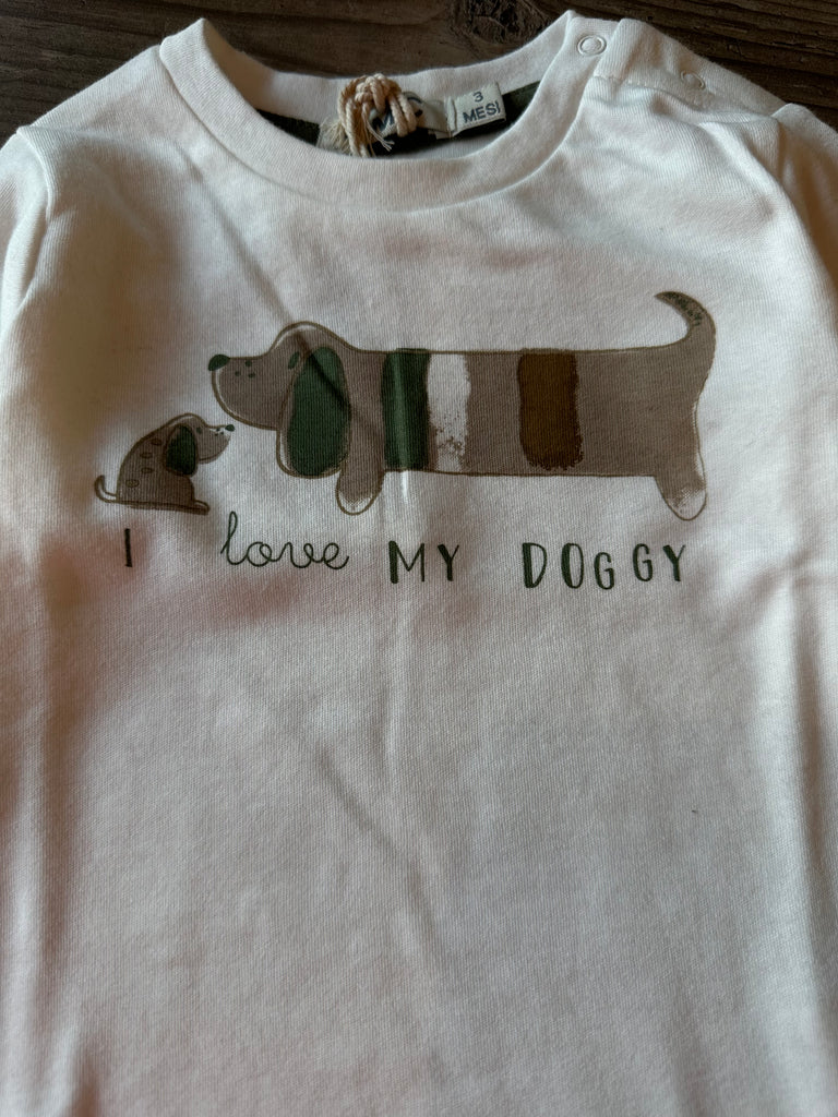 T-shirt in cotone elasticizzato, a girocollo, con polsini, bianca con stampa bassotto sul verde militare e marrone.