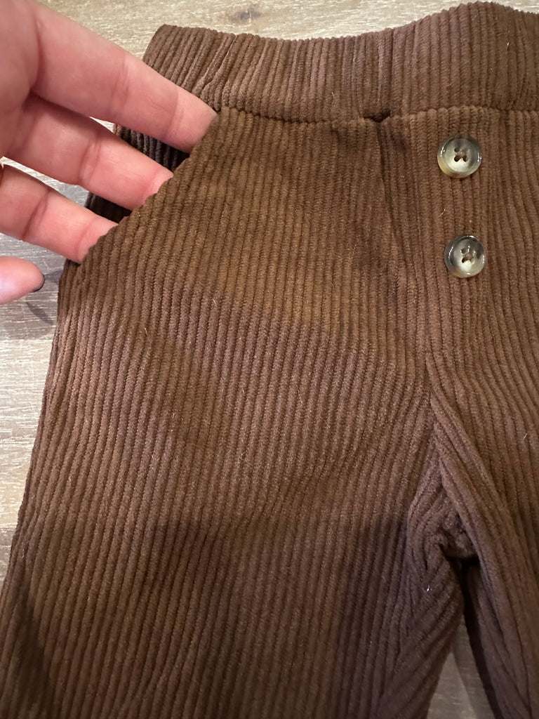 Pantalone in velluto marrone, con elastico in vita, taschine laterali a scomparsa, risvoltini sotto.