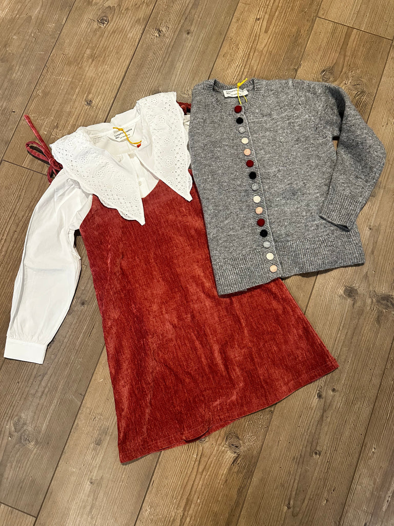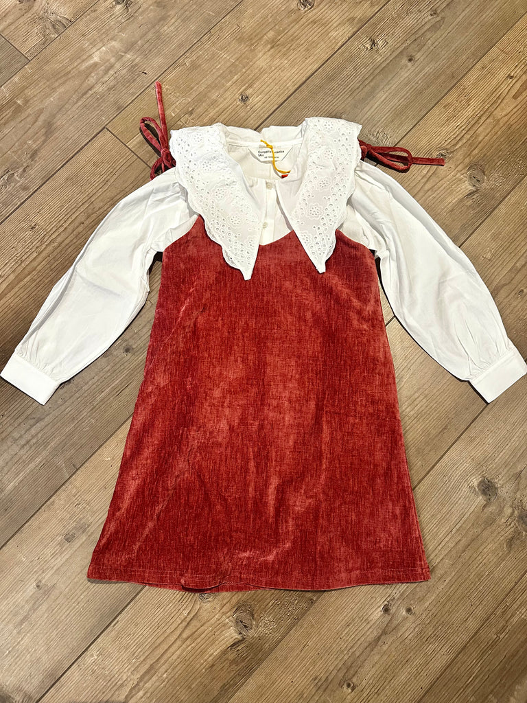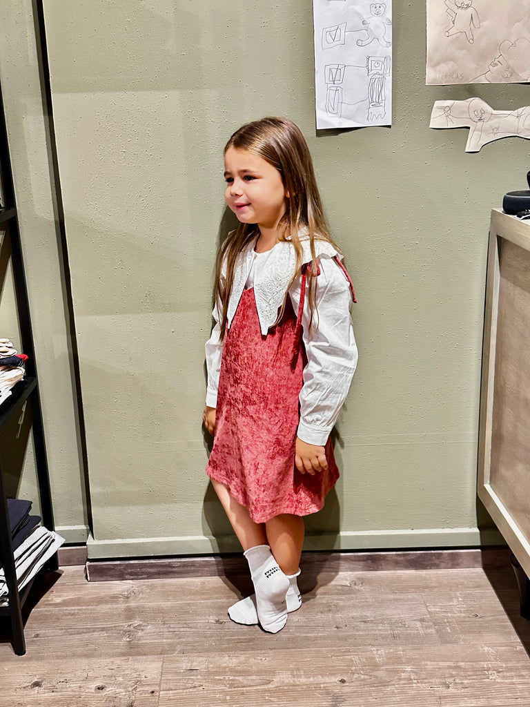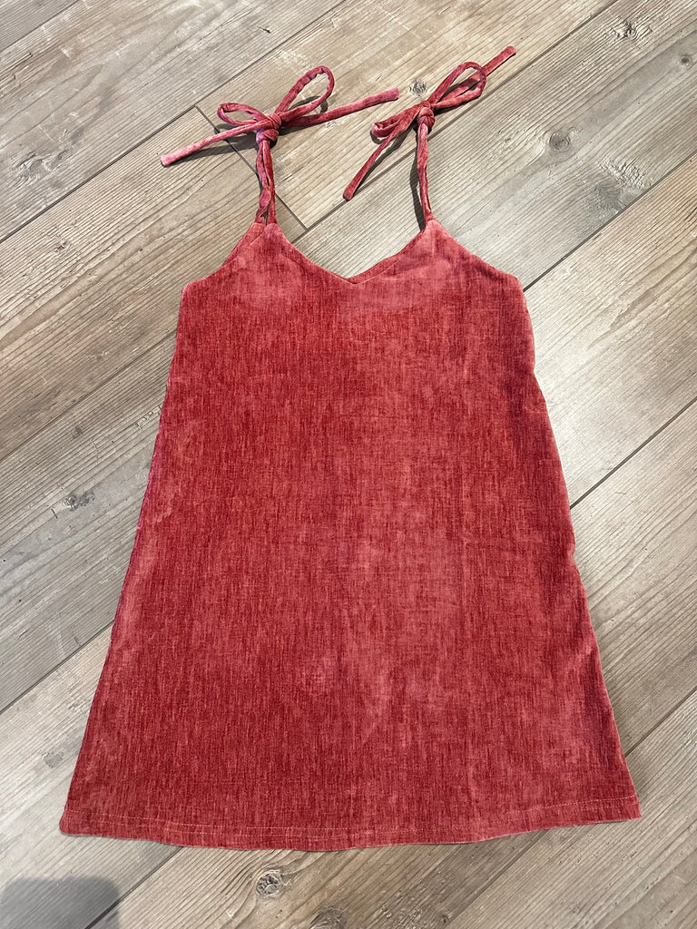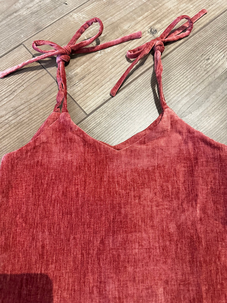 Scamiciata con bretella annodabile, scollo a V, modello leggermente svasato, color rosa antico, effetto velluto.