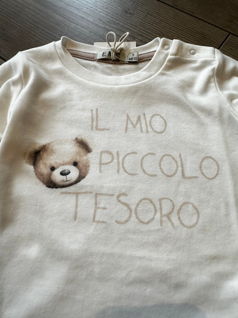 T-shirt a girocollo, in cotone elasticizzato, bianca con stampa muso orsetto e scritta IL MIO PICCOLO TESORO.