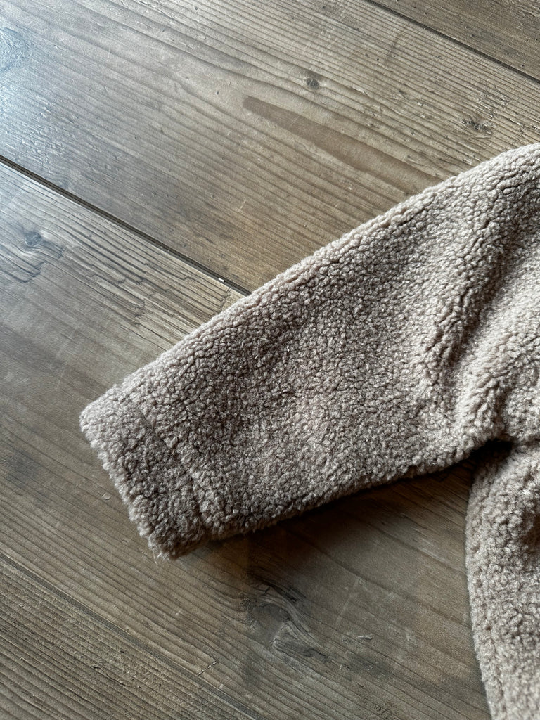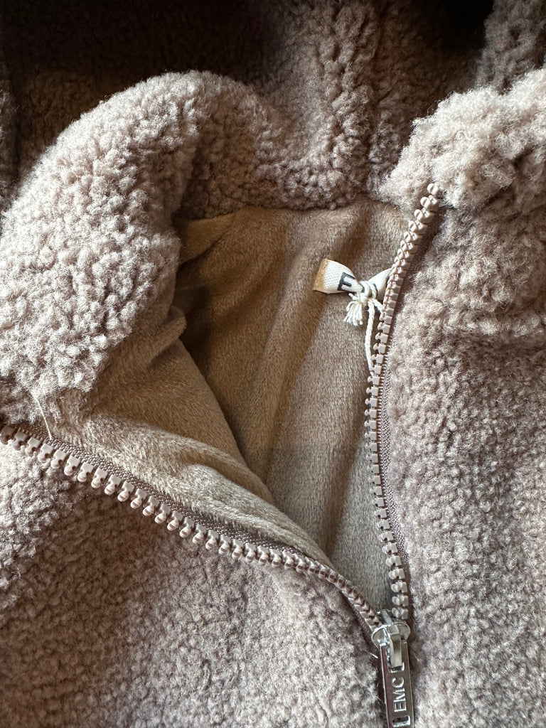 Giubbino teddy, colore écru, con zip frontale, modello ovetto con cannolè, taschine sul davanti, cappuccio con orecchie da orso.
